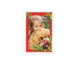 Per degli auguri di Natale originali scegli questo bigliettino personalizzato; stampa in copertina la tua foto, immagine o sfondo e abbinala a questa grafica con pois rosati, disegnati su sfondo rosso con bacche.