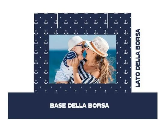 Per la tua borsa da mare abbiamo pensato a questa grafica con sfondo blu e ancore bianche; molto raffinata e di buon gusto potrà fare da sfondo alla stampa della tua immagine o alla tua foto o al tuo brand.