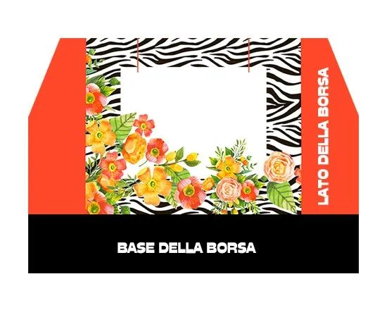 Ci siamo ispirati alle ultime tendenze proposte per le borse mare estive, realizzando la grafica di questa meravigliosa borsa mare: è sostanzialmente composta da una combinazione tra stile zebrato e floreale, con base nera e laterali nel color arancio.