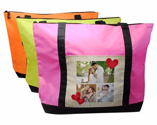 La tua borsa potrà accogliere la stampa di questa grafica a mo’ di mosaico: stilizzata su sfondo cartonato, con i cuori rossi, verrà decorata dalle tue immagini o dalle tue foto ricordo.