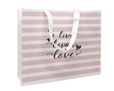 Proposta in tessuto tnt, verrà stampate con questa grafica a fasce bianche e rosa con la scritta romantica, stilizzata in nero; potrai lasciarla così com’è oppure potrai aggiungere foto, immagini, scritte e clipart.