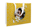 Scegli la possibilità di acquistare la tua shopper su Fotoregali e di personalizzarla con la stampa delle tue foto, immagini o grafiche originali; in tessuto tecnico tnt, verrà colorata con la stampa della tua grafica con margherite, disegnate su sfondo giallo.