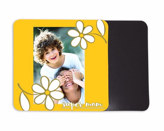 Per la decorazione della tua calamita personalizzata, abbiamo pensato a questo motivo grafico dallo sfondo giallo con margherite e la scritta in bianco, dedicata alla mamma; molto dolce e graziosa, sarà pronta per accogliere anche la tua foto, immagine o sfondo.