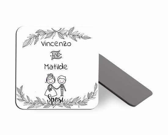 Per le tue calamite nuziali, abbiamo pensato di realizzare questo magnifico magnete; proposta nella forma quadrata, potrà essere decorata con la grafica stilizzata con piccoli sposini.