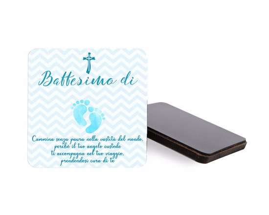 La tua bellissima calamita dalla forma quadrata sarà idonea per la festività del battesimo; in particolare quello di un piccolo bebè, vista la sua grafica nel colore celeste.