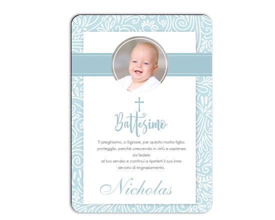 Se hai in mente di voler fare un regalo ad un piccolo bimbo, potrai acquistare questa fantastica calamita personalizzata; fatti conquistare dal motivo grafico dallo sfondo celeste con disegni, che faranno da cornice alla fascia abbinata e alla sua scritta religiosa.