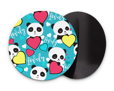 Sfrutta la possibilità di riportare sul tuo supporto magnetico dalla forma rotonda, con la stampa del tuo motivo grafico, con piccoli panda disegnati su sfondo con scritte bianche e cuori colorati.