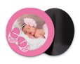Personalizza la tua foto calamita della tua forma rotonda con la stampa della tua immagine, sfondo o icona, da inserire in questo motivo grafico con scarpette nel colore rosa e la cornice abbinata.
