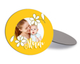 Scegli la possibilità di creare online le tue calamite e di personalizzarle come meglio credi: crea questa foto calamita dalla forma rotonda e decorala con la stampa della tua foto, immagine o sfondo, da abbinare al motivo grafico nel colore giallo, con margherite e la scritta stilizzata.