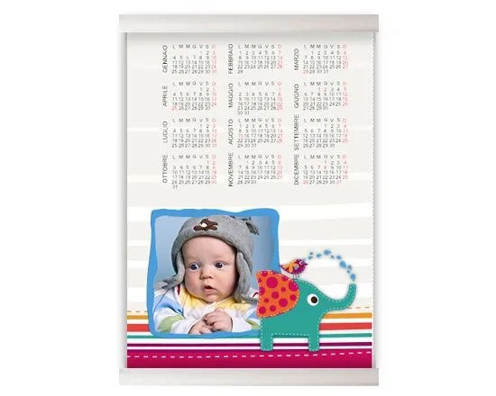 Acquista direttamente online il tuo calendario personalizzato e stampa sul tessuto telato, la stampa della tua immagine, foto o sfondo da decorare con il motivo grafico con il piccolo elefantino colorato, abbinato alle fasce variopinte; potrai inserirci una scritta, un messaggio o una frase caratteristica oppure potrai inserirci delle magnifiche clipart decorative.