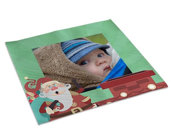 Se hai voglia di stupire i tuoi piccoli bimbi con un pensiero carino, puoi affidarti a questo magnifico centrotavola natalizio; personalizzalo con la stampa della tua foto, da abbinare al motivo grafico con il simpatico Babbo Natale, pronto a buttarsi giù nel camino.