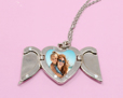 Il ciondolo è a forma di cuore con due ali che si aprono e si chiudono, all'interno viene custodita l'immagine.