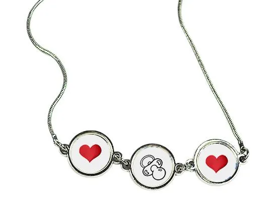 Presta attenzione al ciondolo della tua collana personalizzata composta da tre cerchi e rendila graziosa, con la sua grafica con il ciuccio disegnato nel cerchio centrale, abbinato ai cuori nel colore rosso riposti in quelli laterali.