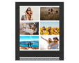 Questa composizione ti permette di inserire 6 foto sul fronte e se vorrai anche un testo o la data di una ricorrenza importante sulla fascia nera posizionata sotto i riquadri.