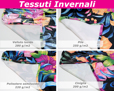 - Tessuti disponibili: chiffon (90 g/m²), seta poliestere (105 g/m²), raso lucido (120 g/m²), poliestere leggero opaco (100 g/m²), pile (250 g/m²), ciniglia (200 g/m²), velluto lucido (280 g/m²), poliestere semilucido (220 g/m²)