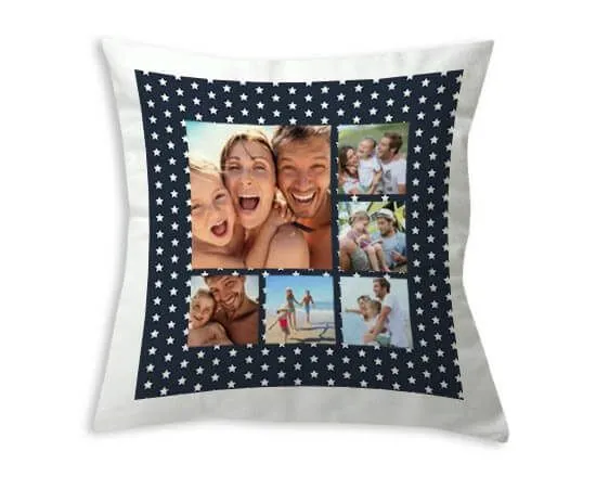 Fai in modo che il tuo cuscino personalizzato dalla forma quadrata possa essere davvero speciale; stampa sulla federa le tue foto, immagini o sfondi da abbinare al motivo grafico collage con stelline bianche disegnate su sfondo blu.