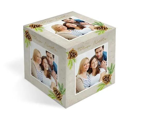 Crea il tuo cubo fotografico e stampa su ogni singola faccia, le tue foto o immagini singolari abbinate al motivo grafico natalizio, con sfondo beige, pigne e ramoscelli; alla già presente scritta, potrai aggiungerne una tutta tua o delle preziose clipart decorative.