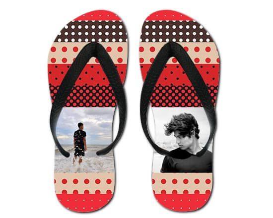 I pois riprodotti in diversi colori su trame stilizzate nel colore rosso, marrone e beige, comporranno il motivo grafico delle tue infradito; da completare con una scritta che ti rappresenti o con la stampa della tua immagine, saranno l’accessorio più originale che tu possa aver acquistato e creato.