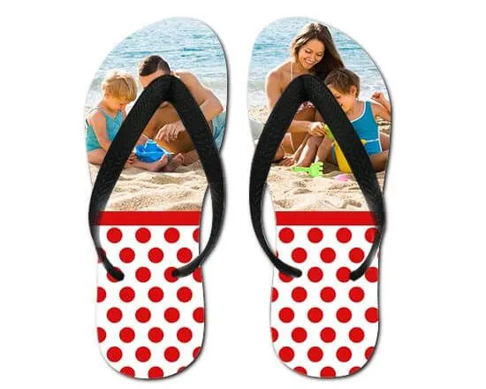 Per le tue infradito abbiamo realizzato questa grafica con pois rossi riprodotti su sfondo bianco, di differenti dimensioni, decoreranno l’aspetto delle tue mitiche ciabattine; fatti conquistare dalla possibilità di personalizzare con il tuo logo aziendale, con una scritta o un’immagine speciale.