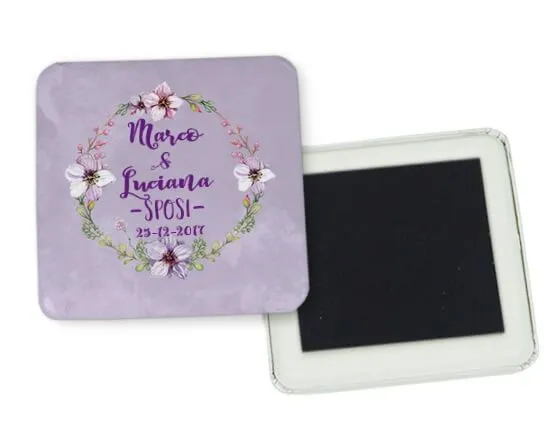 Se stai cercando un gadget particolare che possa essere il promemoria del tuo evento, puoi affidarti a questo in metallo; nella forma quadrata verrà decorato sulla superficie con la stampa grafica nel colore viola, con la cornice di fiori abbinata.