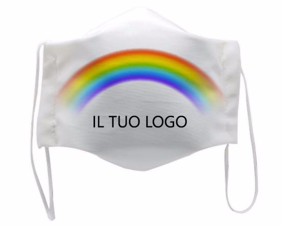 Abbiamo creato la grafica con arcobaleno, che è oramai il simbolo di questo particolare periodo, per darti la possibilità di acquistare le mascherine personalizzate in tessuto, personalizzandole con il logo della tua azienda o associazione, oppure una qualsiasi altra grafica, sulla parte rimanente della superficie della mascherina.