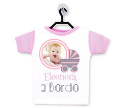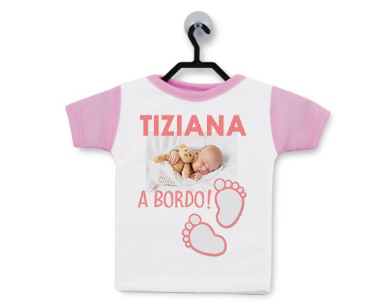 La tua mini t-shirt è pronta per accogliere la stampa della tua foto, immagine o sfondo sulla parte frontale; arricchita dal motivo grafico nel colore rosa con impronte e scritta, può essera appesa all’interno dell’auto per comunicare la presenza di un bimbo a bordo.