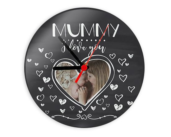 Acquista questo orologio con foto sul nostro sito e personalizzalo con la stampa della tua foto, immagine o sfondo da abbinare a questo tema grafico dallo sfondo grigio, con cuoricini bianchi e la scritta abbinata al grande cuore; perfetto magari per la tua mamma, sarà il regalo perfetto da tenere a casa.