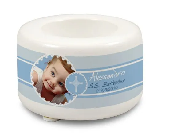 Un elegantissimo portacandela che puoi realizzare direttamente online è questo: proposto in ceramica bianca, accoglierà la stampa della tua immagine o della tua foto, associata a questa grafica con dallo sfondo celeste abbinato al simbolo religioso e ad una fascia centrale; potrai scrivere una frase, un pensiero o un motto che sia in perfetta sintonia con la tua riproduzione.