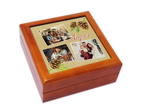 Il nostro sito ti da la possibilità di realizzare il tuo porta gioielli e di decorarlo sul coperchio con qualsiasi tua riproduzione; scegli tre foto o immagini personali e riportale all’interno di questa grafica con sfondo beige, pigne e ramoscelli.