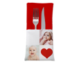 Se hai voglia di donare qualcosa di particolare per la tua magica occasione, scegli questo portaposate; proposto in tessuto accoglie sulla tasca la stampa delle tue immagini, foto o sfondi, da abbinare a questo motivo grafico con cuore rosso.