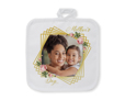 Se non sai cosa regalare per una determinata ricorrenza o magari hai voglia di creare un gadget speciale per il tuo evento, puoi confidare il questa presina; nella forma quadrata con angoli smussati, accoglierà la stampa della tua foto o della tua immagine, abbinata a questa grafica dalla cornice dorata arricchita da eleganti fiori.