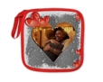 Riproduci sul tessuto in poliestere, la tua foto ricordo e abbellisci il tuo montaggio, con la grafica dallo sfondo grigio con cuori rossi; scrivi un pensiero, una frase o un messaggio.