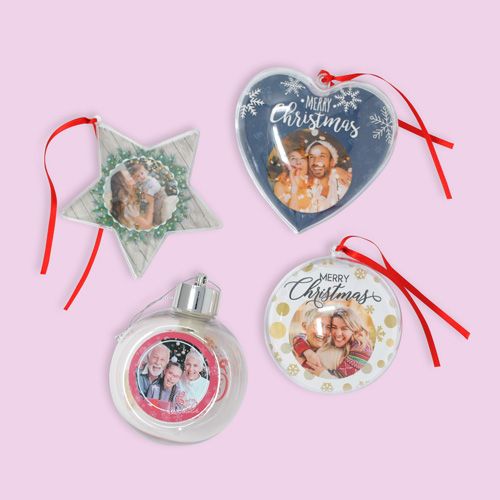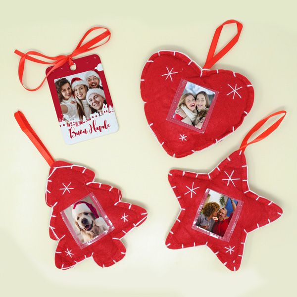 Scegli palline di Natale a forma di cuore per sorprendere la tua dolce metà con un regalo romantico oppure sorprendi i tuoi nipotini donando loro una decorazione a forma di stella stampata ciascuna con la loro foto.
