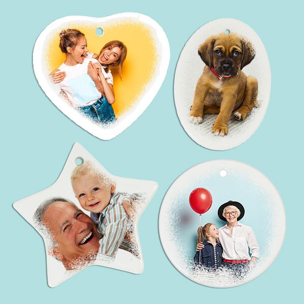 Le decorazioni natalizie personalizzate sono disponibili in varie versioni. Le decorazioni natalizie in ceramica a forma di magliettina, stella, di fiocco di neve, di cuore oppure, più semplicemente, ovali e tonde sono la scelta ideale per dare un tocco di eleganza all'albero di Natale. Decorali con le tue fotografie più belle, permetteranno infatti all'albero di brillare sotto la luce di tutti i tuoi ricordi.