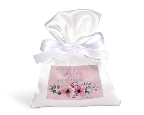 Il tuo portaconfetti in raso verrà personalizzato sulla stoffa, con la grafica dallo sfondo rosa, con composizione di fiori stilizzata; perfetta per essere abbinata alla tua scritta, frase o data, potrà essere abbellita come più ti piace.