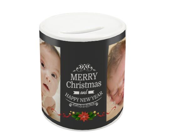 Il salvadanaio è un regalo prezioso che potrai donare sotto Natale: personalizzalo con la stampa delle tue immagini da inserire, all’interno di questo motivo grafico con struttura collage, dallo sfondo scuro, con scritta bianca e decorazioni natalizie.