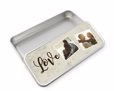 Regala alla tua dolce metà questa scatolina in metallo, personalizzata con una grafica romantica preparata per accogliere due tra le foto che amate di più.