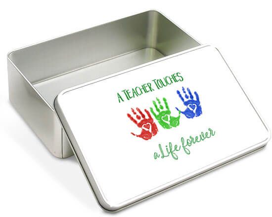 Se hai voglia di donare qualcosa di unico alla tua maestra ti consigliamo l’acquisto di questa speciale scatola di latta; verrà personalizzata sul coperchio, con la stampa grafica con impronte colorate e la scritta in verde.