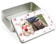Personalizza il coperchio di questa scatola di latta con la tua immagine, foto o sfondo, da abbinare al motivo grafico con il tenero orsacchiotto e la sua tempesta di cuori; potrai abbinare al tuo fotomontaggio, una frase, un pensiero o una scritta da stilizzare, che sia in grado di dare il giusto significato, al tuo magnifico pensiero.