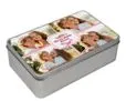 Le scatole di latta sono sempre state degli utilissimi oggetti da acquistare per riporre cibi da conservare o averi personali; noi ti proponiamo questa meravigliosa scatola nella forma rettangolare da personalizzare sul coperchio con le tue foto.