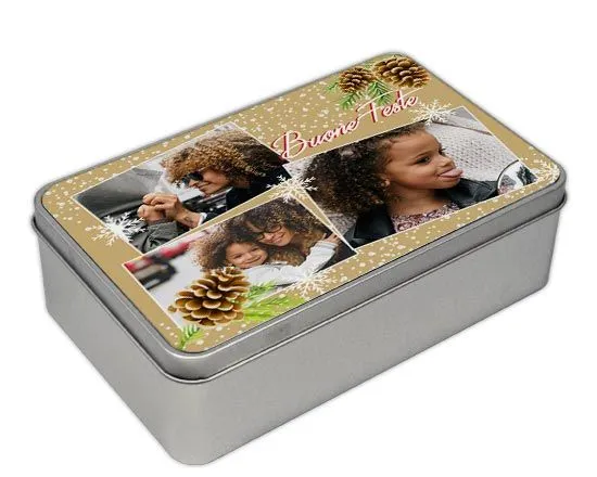 Le scatole di latta sono sempre magnifiche come regalo da donare per il tuo Natale; scegli questa per la sua grafica natalizia con sfondo tenue, tre riquadri nei quali inserirai le tue immagini e preziose pigne decorative.