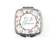 Personalizza il tuo specchietto da borsetta, riportando sul coperchio frontale la stampa della tua immagine, della tua foto o il tuo logo, da abbinare a questa grafica con sfondo floreale e la sua cornice dal colore viola posta al centro.