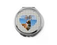 Gli specchietti da borsa sono gli accessori più amati dalle donne; acquista questo meraviglioso specchietto da borsetta e decoralo con la grafica dallo sfondo tartan bianco e grigio e il cuore posto al centro con fiocco e pois in pendant.