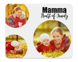 Se hai voglia di realizzare questo mouse pad ti basterà entrare nel tuo piano di lavoro e caricare le tue tre foto, che verrà riposte nei riquadri di questo motivo grafico dallo sfondo bianco con frase dedicata alla tua mamma.