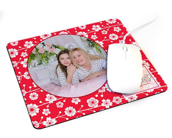 Colora lo stile del tuo tappetino mouse in tessuto e personalizzalo con la stampa della tua foto, immagine o sfondo da abbinare al motivo grafico con fiorellini bianchi, disegnati su sfondo rosso e da abbellire con la cornice stilizzata.