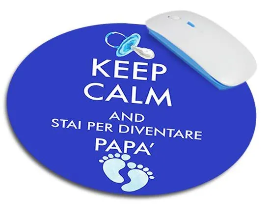 Scegli la possibilità di personalizzare il tuo tappetino mouse dalla forma circolare con la stampa della tua foto, immagine o sfondo singolare da abbinare al motivo grafico con il Keep Calm, riprodotto su sfondo blu con impronte e ciuccio.