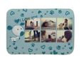 Se conservi delle foto che ti ritraggono con il tuo animale a quattro zampe puoi utilizzarle per stamparle sul poliestere morbido del tuo tappetino per animali; proposto con grafica collage dallo sfondo celeste, con il disegno di un cagnolino e decorazioni, sarà un bellissimo accessorio per la cuccia.
