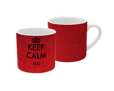 La tazzina viene decorata da questa grafica con il “Keep Calm” da completare secondo il tuo messaggio personale; stilizzata in grassetto su sfondo rosso fuoco.