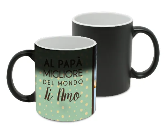 Scegli di essere originale con la tazza magica che lascerà il tuo papà senza parole! Sembra una semplicissima tazza nera, ma con le bevande calde, apparirà per magia la grafica scelta, che tu stesso avrai personalizzato con la tua foto preferita!