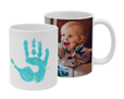 Scegli questa tazza con foto personalizzata e sfrutta la possibilità di decorarla con il motivo grafico, fatto dal palmo della mano effetto impronta nel colore celeste, abbinato allo spazio per inserire all’interno la tua foto, immagine o sfondo.